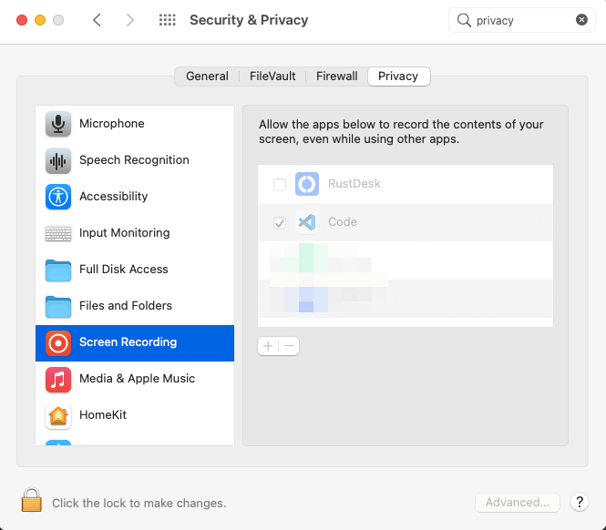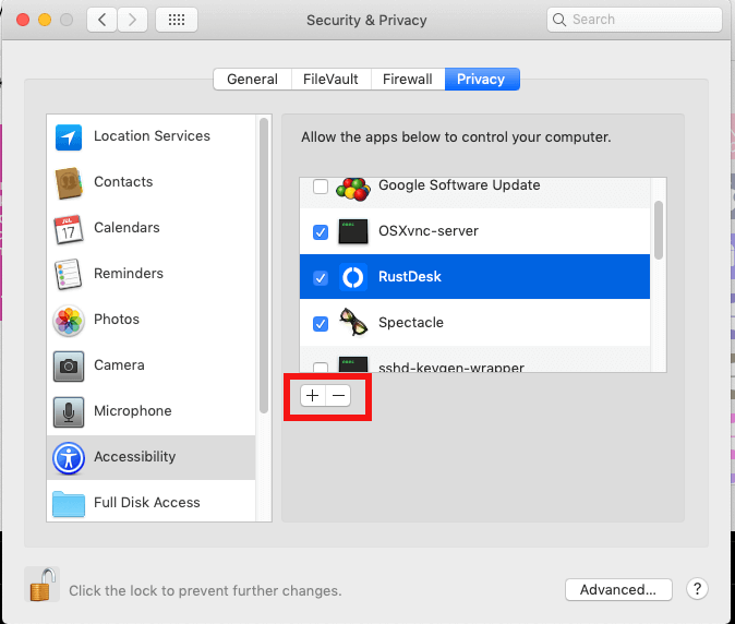 Allez maintenant dans l'onglet "confidentialité", sélectionnez "accessibilité" et "+" pour ajouter Rustdesk depuis les applications: