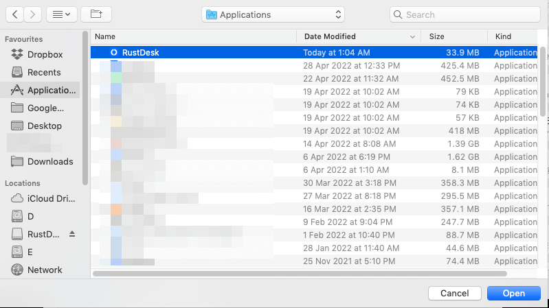 Allez dans Applications et sĂ©lectionnez âRustDeskâ puis faites âOuvrirâ